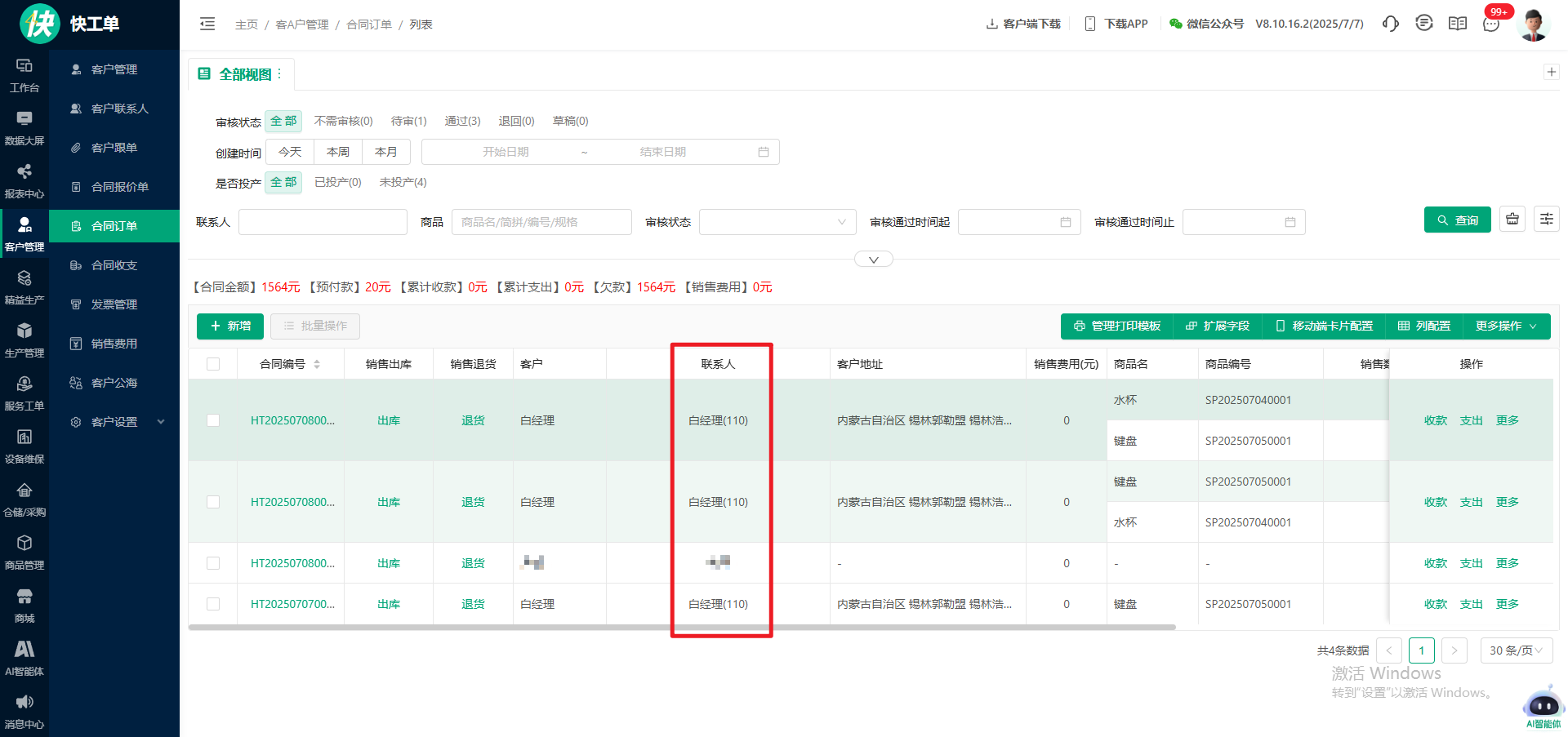 合同列表联系人字段展示联系电话
