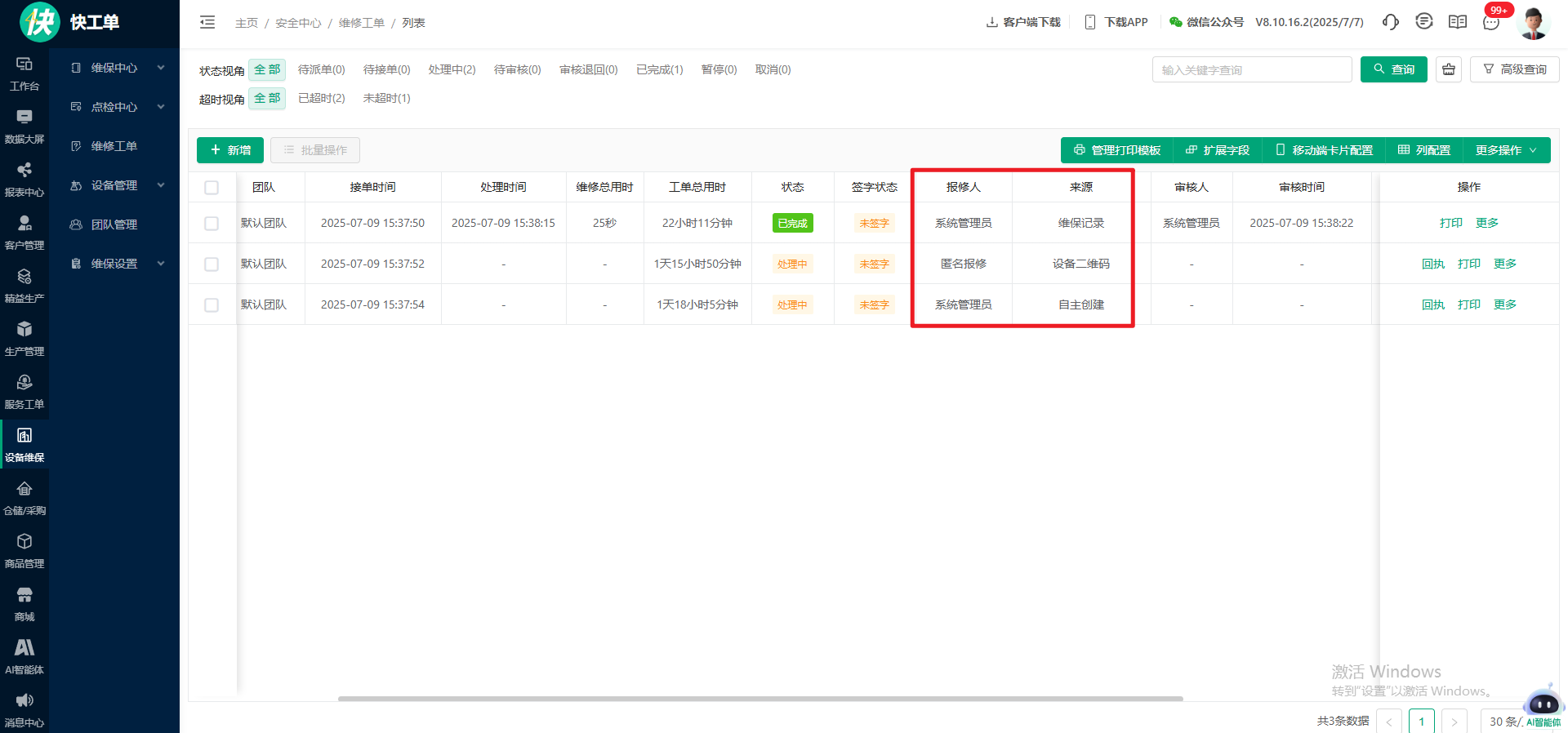 1.新增字段-来源,展示:自主创建、设备二维码、维保记录;