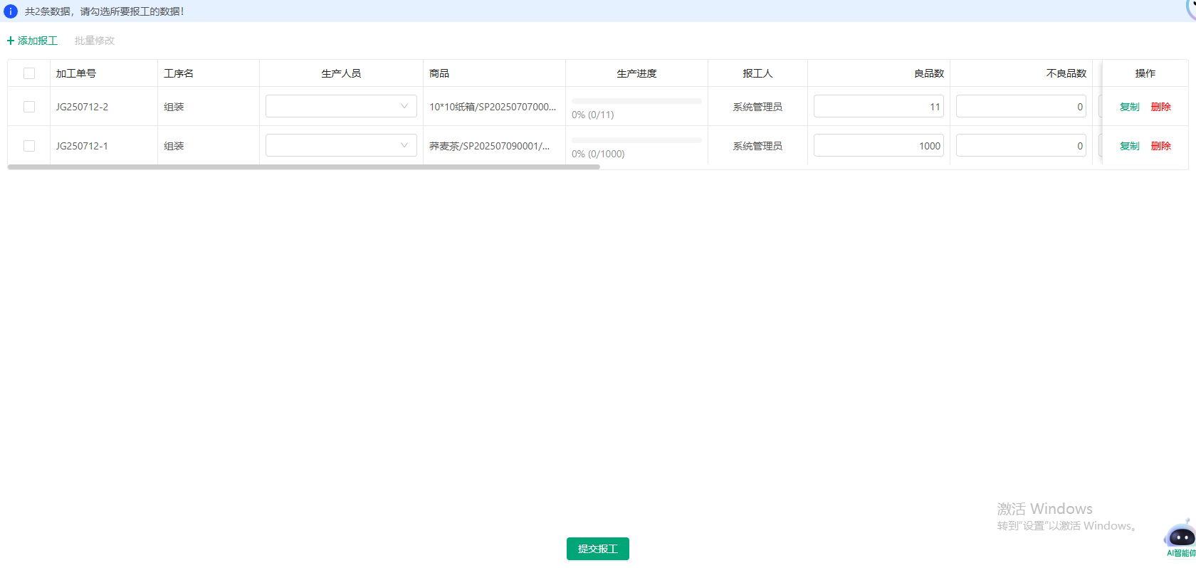 2.生产任务-批量操作:添加批量报工;