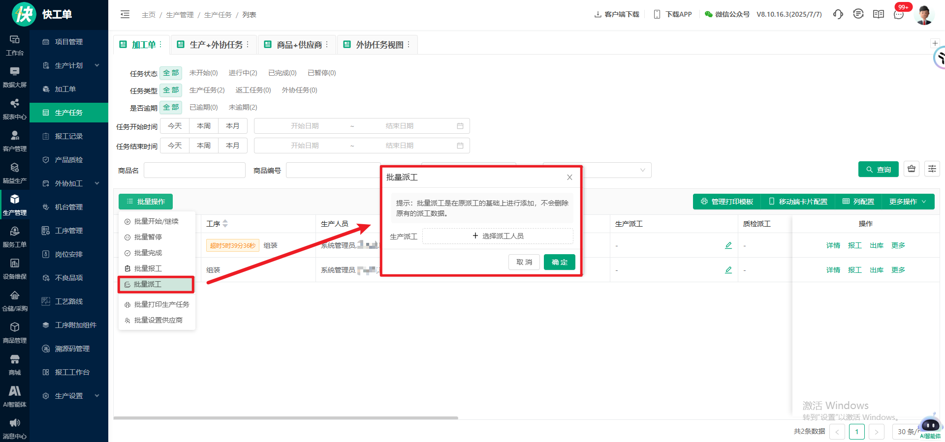 1.生产任务-批量操作:添加批量派工;