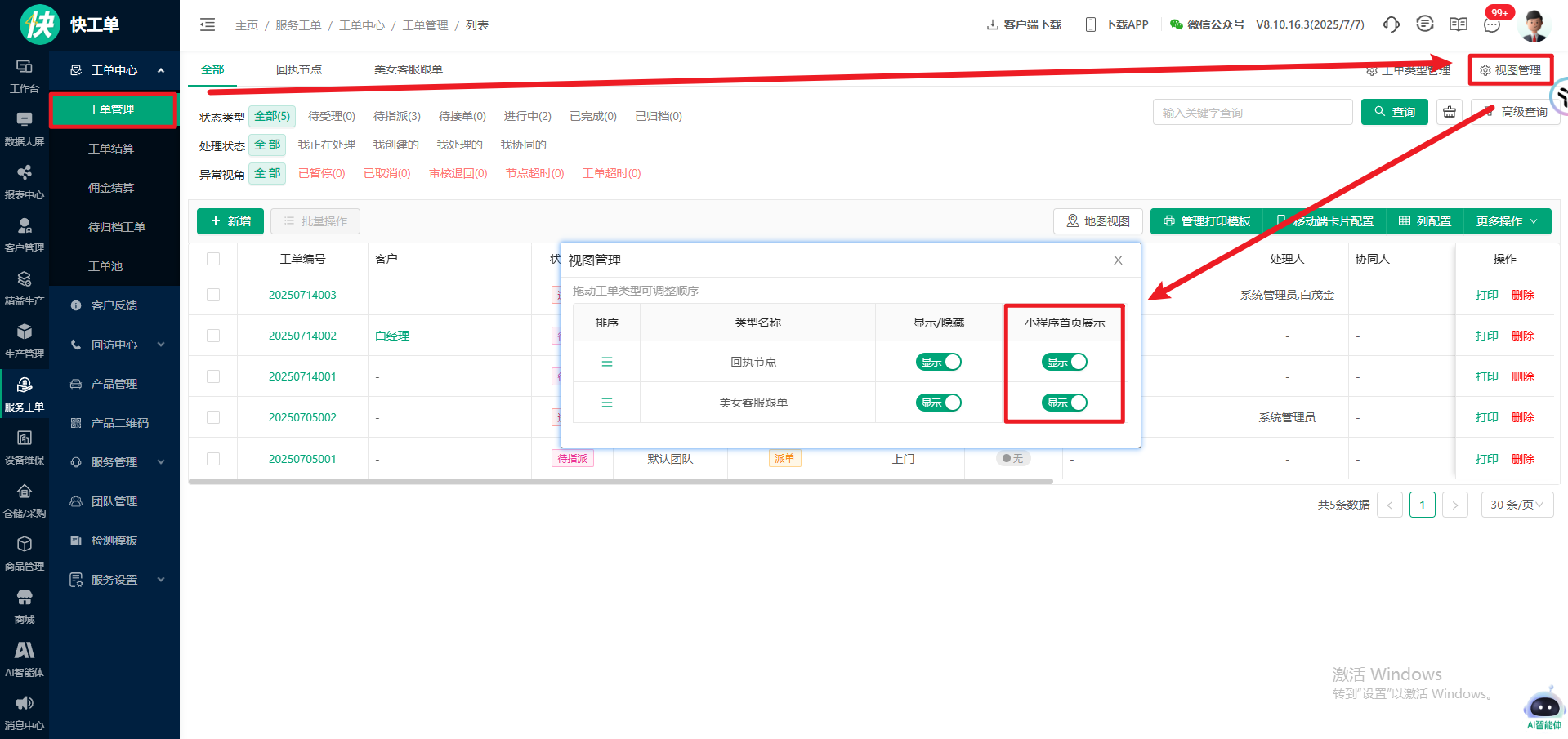1.服务工单-视图管理:添加小程序首页展示开关;