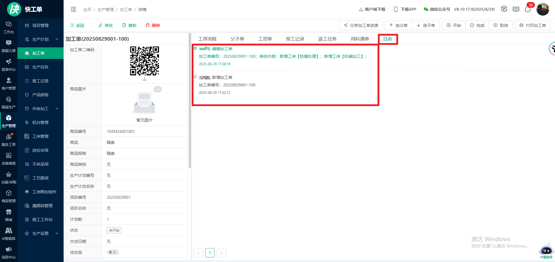 加工单详情增加日志tab页,支持查看加工单修改记录;