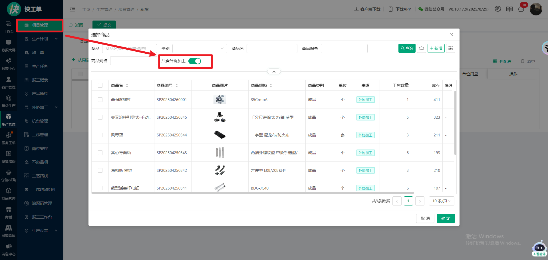 外协项目:商品选择器,增加“只看外协加工”开关,支持只查看来源为外协加工的商品,或者查看所有来源类型的商品;