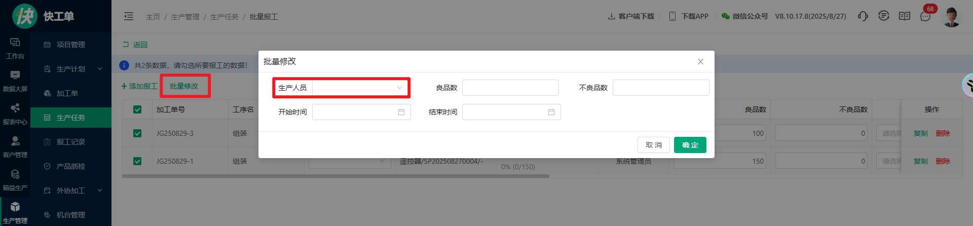 2、批量报工的批量修改操作能批量选择生产人员;