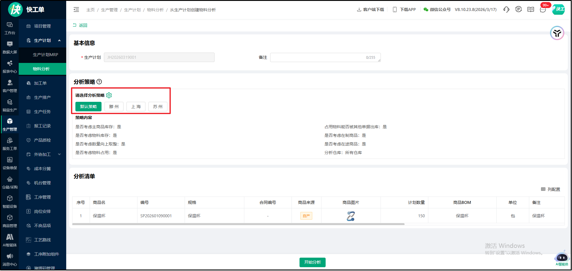 1.物料分析时,支持配置仓库策略;